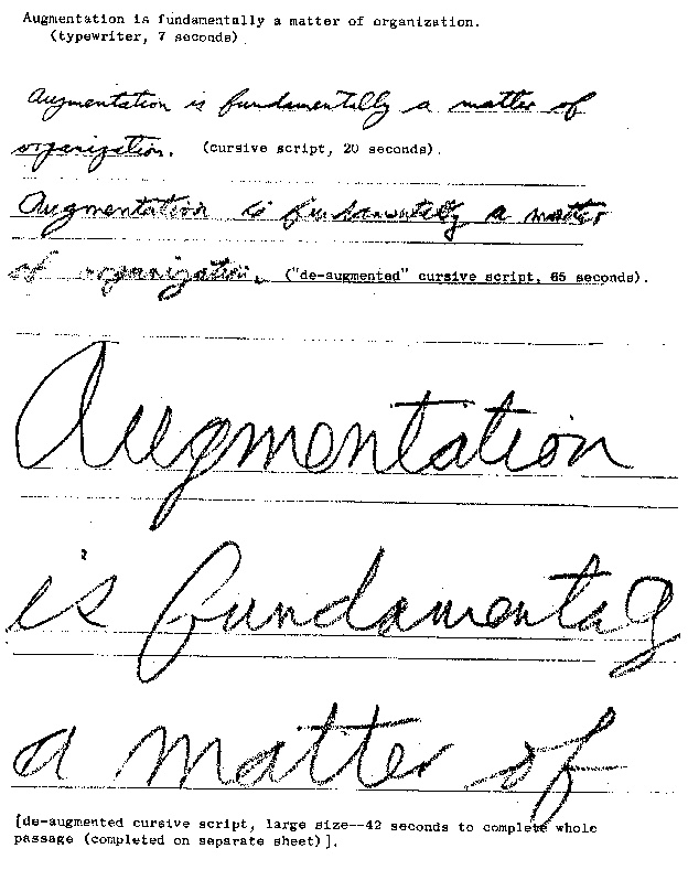 Η επαύξηση της ανθρώπινης σκέψης με τη συνδρομή κάποιου εργαλείου είναι μια πολύ δυνατή ιδέα, αλλά, ταυτόχρονα, είναι κάπως δύσκολο να την μοιραστούμε γιατί δεν υπάρχουν πολλά πετυχημένα παραδείγματα. Για αυτόν τον σκοπό, ο Douglas Engelbart συνήθιζε να κάνει ένα πείραμα ως αναλογία, στο οποίο ζητούσε από τους συνομιλητές του να γράψουν το ίδιο κείμενο με μια γραφομηχανή, με ένα στυλό, και, τέλος, με ένα στυλό δεμένο με ένα τούβλο.