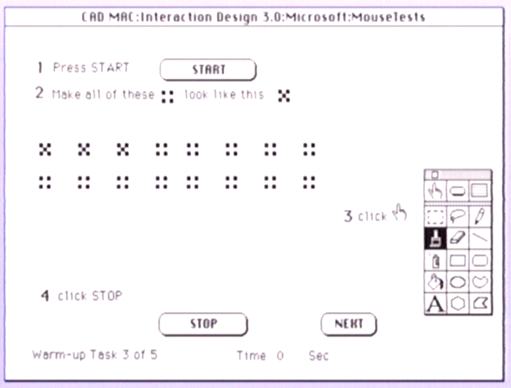 Οι σχεδιαστές νέων συσκευών διάδρασης αναπτύσσουν ειδικό λογισμικό προσομοίωσης των βασικών διεργασιών που θέλουν να επιτελεί η νέα συσκευή και το χρησιμοποιούν για να αξιολογήσουν με τη συμμετοχή των χρηστών εναλλακτικές λύσεις. Για το ποντίκι, οι δοκιμές με χρήστες αξιολογούν την επιτυχία και τον χρόνο εντοπισμού στόχων και μετακίνησης αντικειμένων και συγκρίνουν διαφορετικές σχεδιάσεις του υλικού και διαφορετικές ρυθμίσεις του λογισμικού.